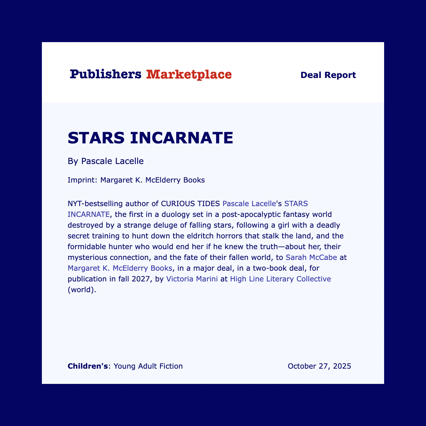 From NYT-bestselling author of CURIOUS TIDES Pascale Lacelle comes STARS INCARNATE, the first in a duology set in a post-apocalyptic fantasy world destroyed by a strange deluge of falling stars, following a girl with a deadly secret training to hunt down the eldritch horrors that stalk the land, and the formidable hunter who would end her if he knew the truth—about her, their mysterious connection, and the fate of their fallen world. Expected fall 2027.